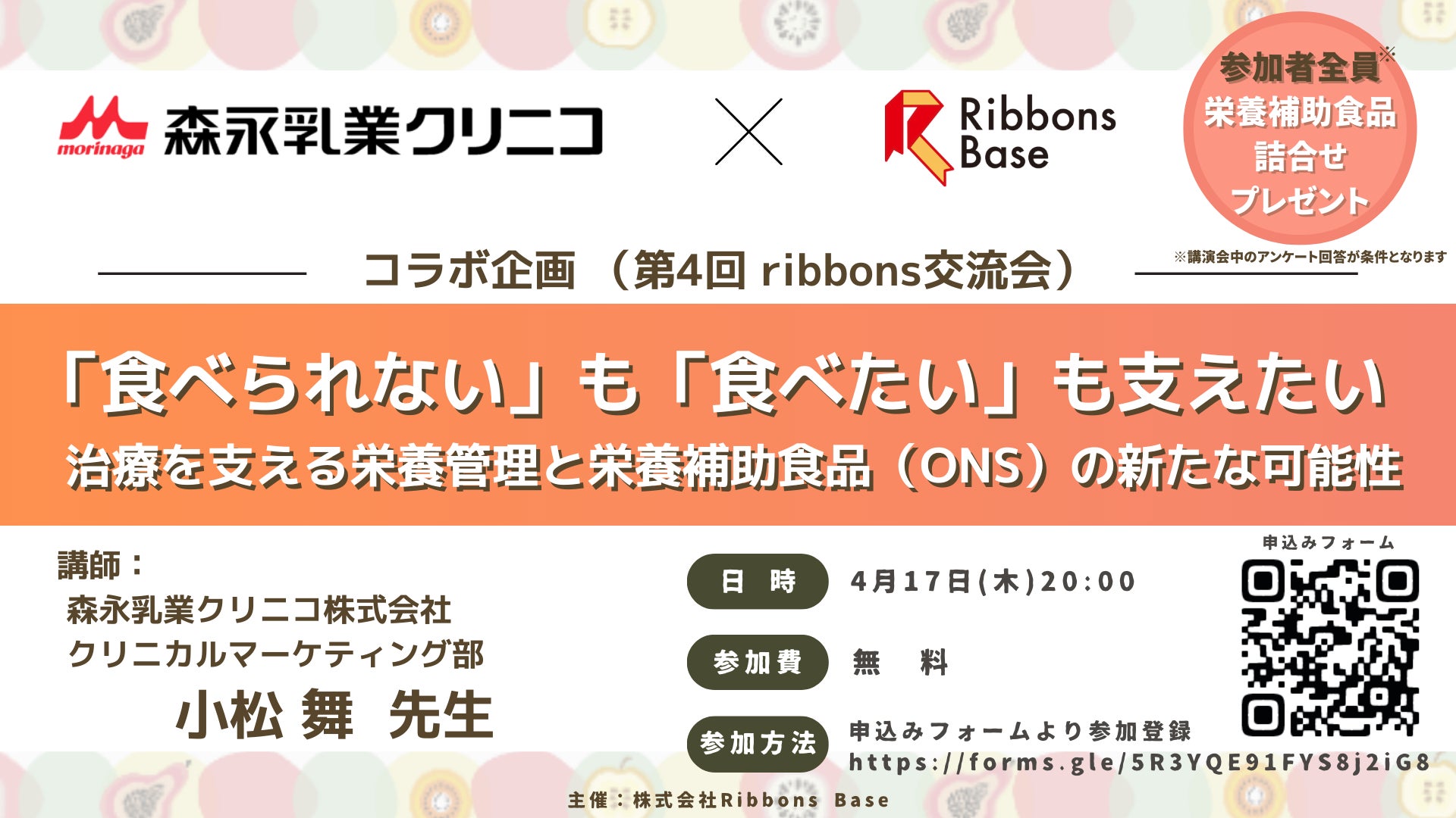 がん患者さん向け治療日記シェアアプリ「ribbons」を運営する株式会社Ribbons Baseは、森永乳業クリニコ株式会社様とコラボレーションし、2025年4月17日(木)にオンライン交流会「『食べられない』も『食べたい』も支えたい 治療を支える栄養管理と栄養補助食品(ONS)の新たな可能性」を開催することをお知らせいたします。
